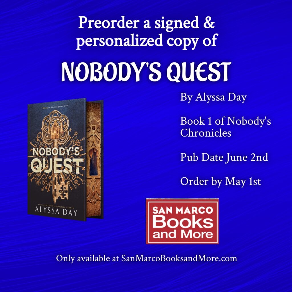 Get your signed and PERSONALIZED copy of Nobody’s Quest! By Alyssa Day | March 20, 2026 | 0 Local to me in Jacksonville, Florida? Come see me the 20th with these amazing authors!! Too far away? Preorder your copy of NQ before May 1st to get awesome preorder incentives with your SIGNED and PERSONALIZED order! Posted in Nobody, travel